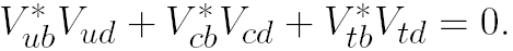 Because of this, the dot of a column or row with its complex conjugate is equal to 1, and the dot with the complex conjugate of other rows or columns must be 0. Applying this to the 1st and 3rd columns of the CKM matrix, we get conditions for a triangle in the complex plane,