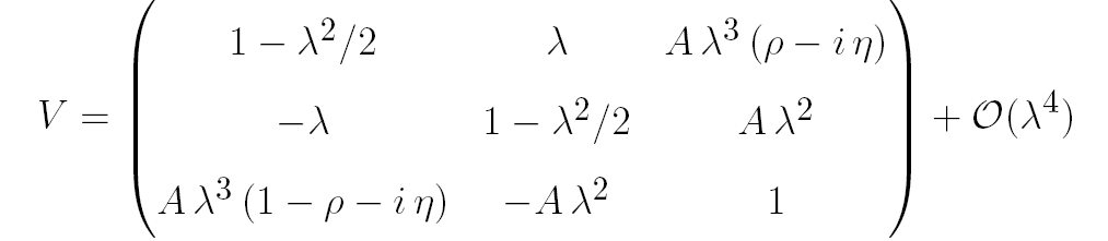 So, this approximates the matrix to the order of &lambda3. This parametrization is extremely important for us. Thanks to it, we can tell from it that CP is conserved to the order of &lambda2, and only violated in order of &lambda3. Furthermore, the branching ratio of some special decays can be directly expressed in terms of the parameters in the Wolfstein parametrization. The reason is the following.
